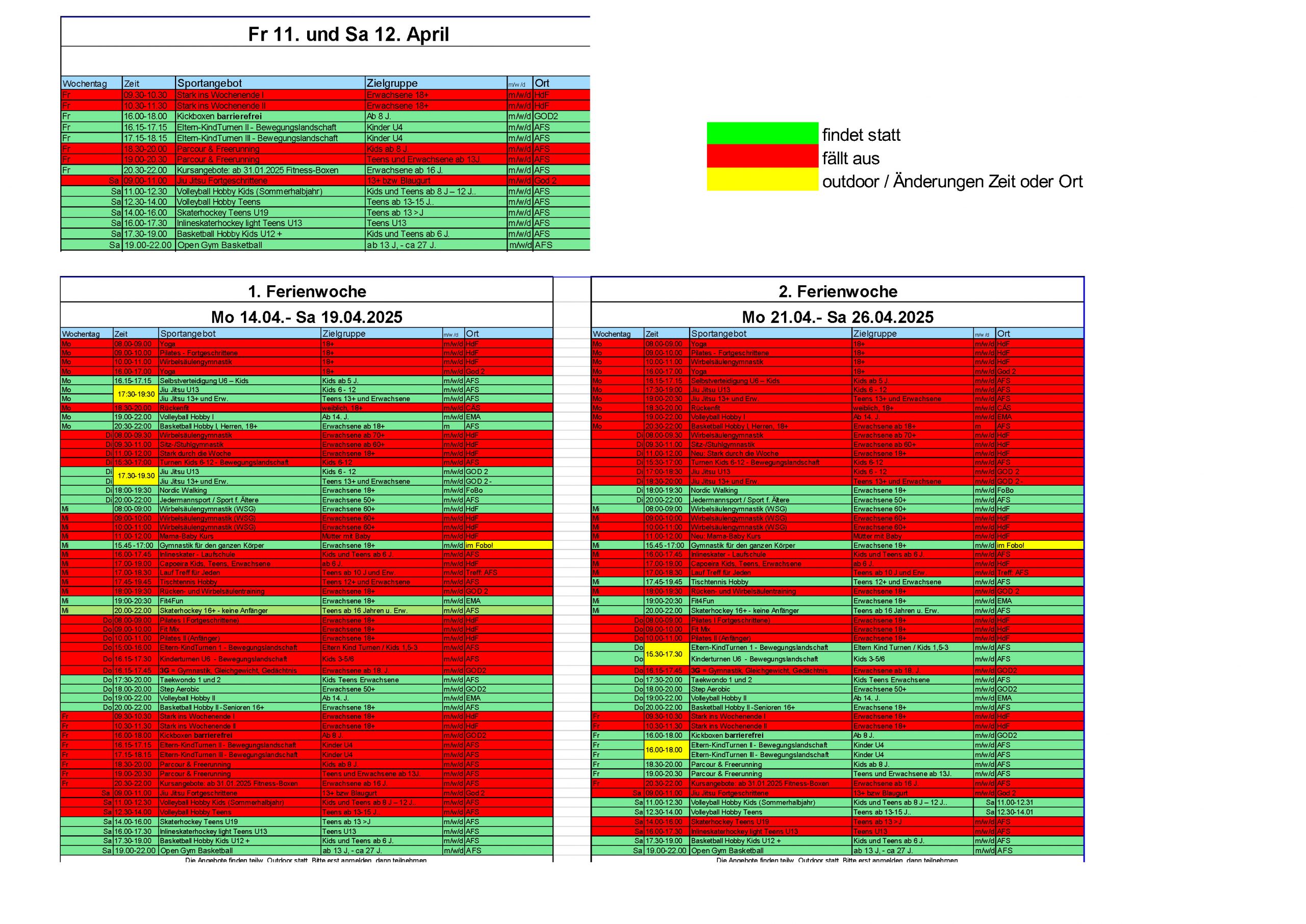 In den Osterferien 2025 fallen die normalen Sport- und Kursangebote aus bzw. werden ersetzt durch die folgenden eingeschränkten Angebote: